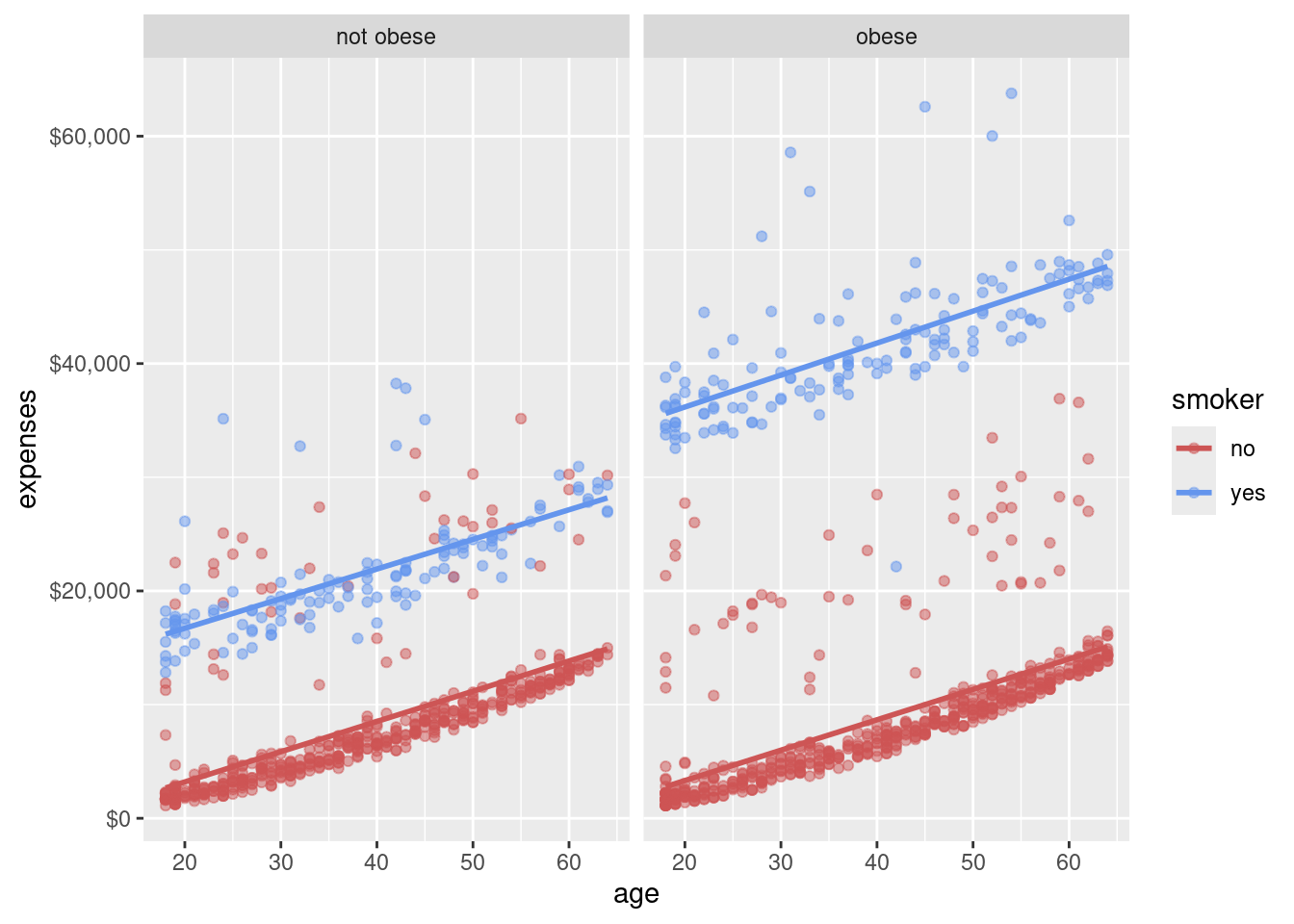 - There is a positive linear relationship between age and expenses. The relationship is constant across smoking and obesity status (i.e., the slope doesn’t change).