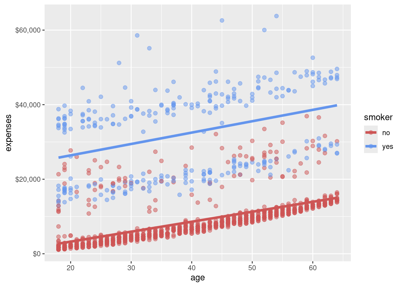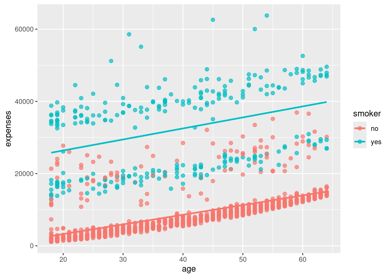 mapping = aes(x = age, y = expenses, color = smoker)) +
