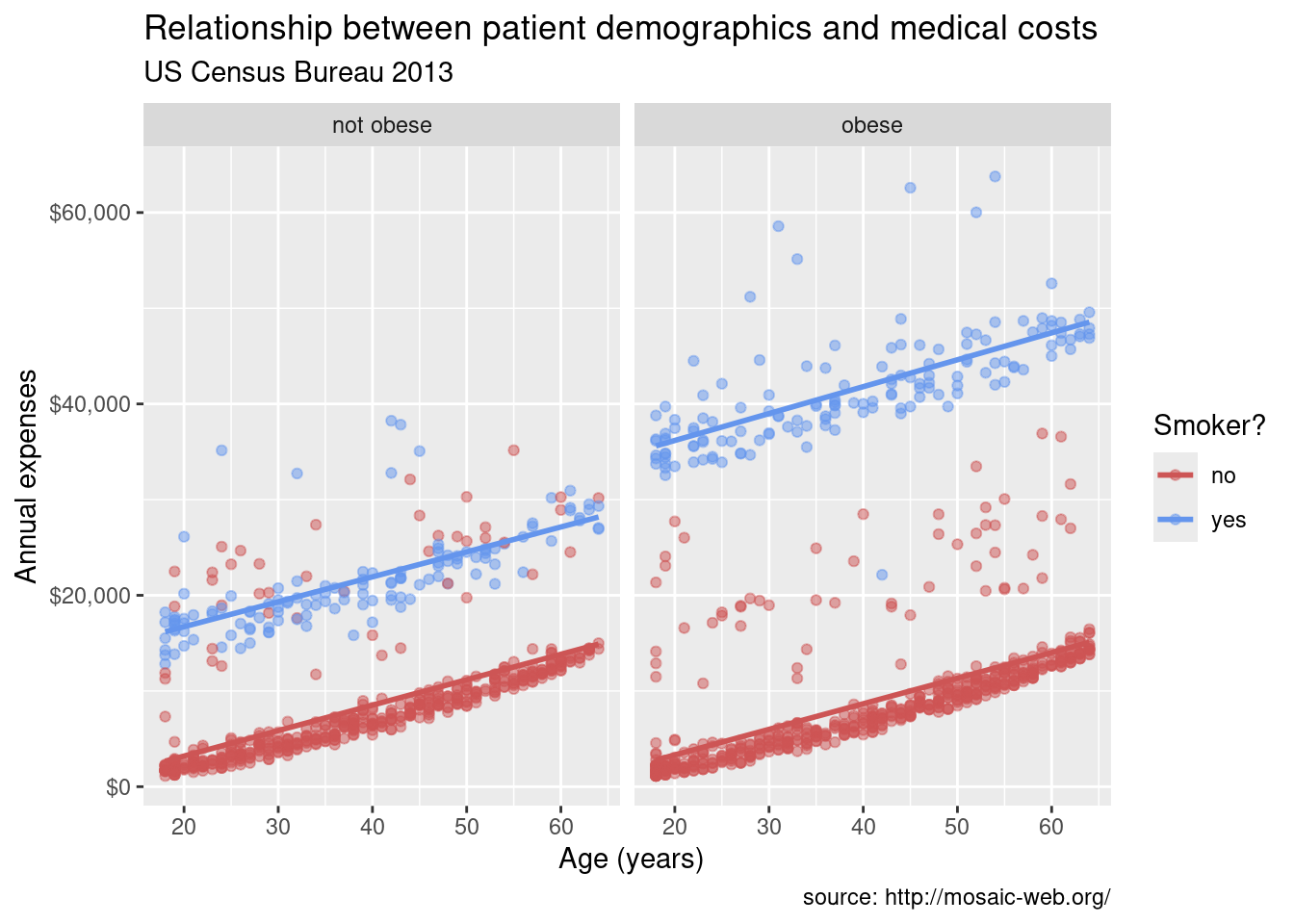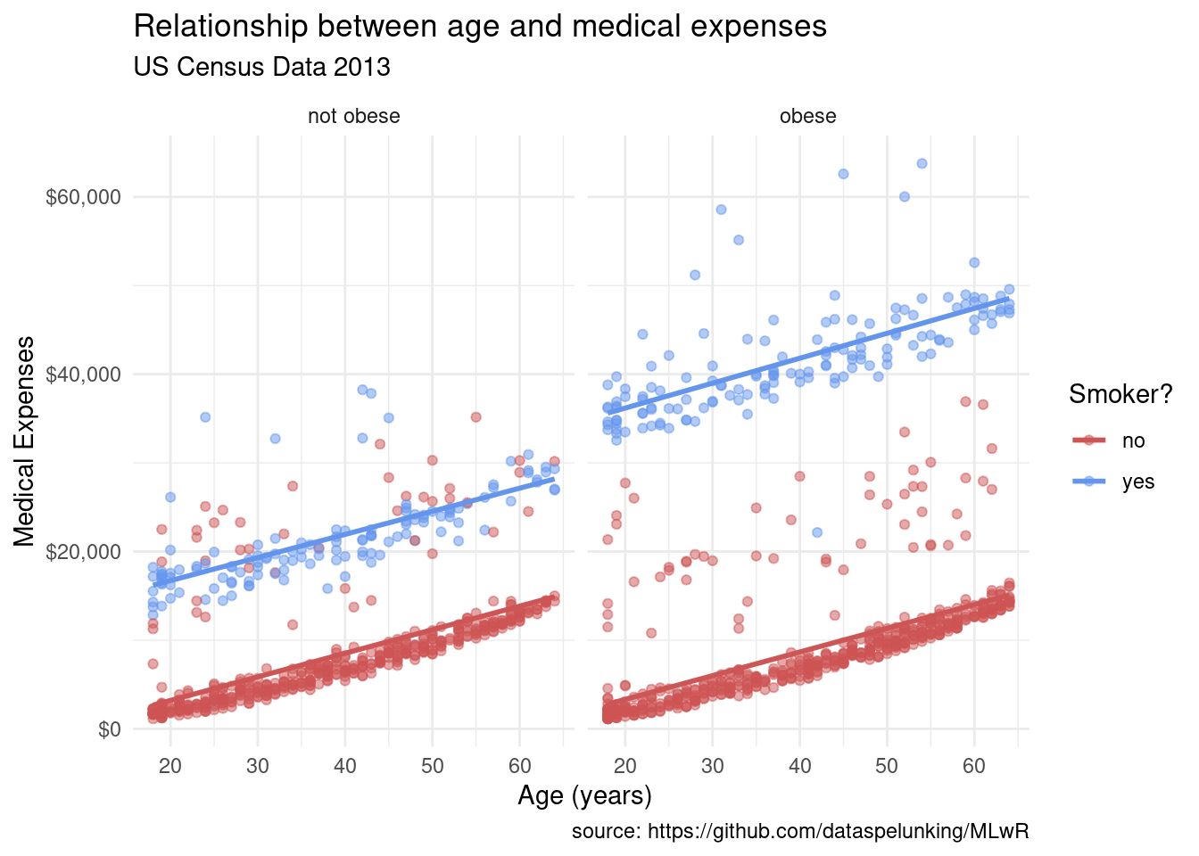 In Figure 17.7, we used facet_wrap(~obese) to create separate plots for obese and non-obese individuals. This allows us to compare the relationship between age and expenses for these two groups side by side. Pretty cool, right? We have now created a plot that shows the relationships among age, smoking status, obesity, and annual medical expenses. In essence, we have placed four dimensions of data into a two-dimensional plot!
