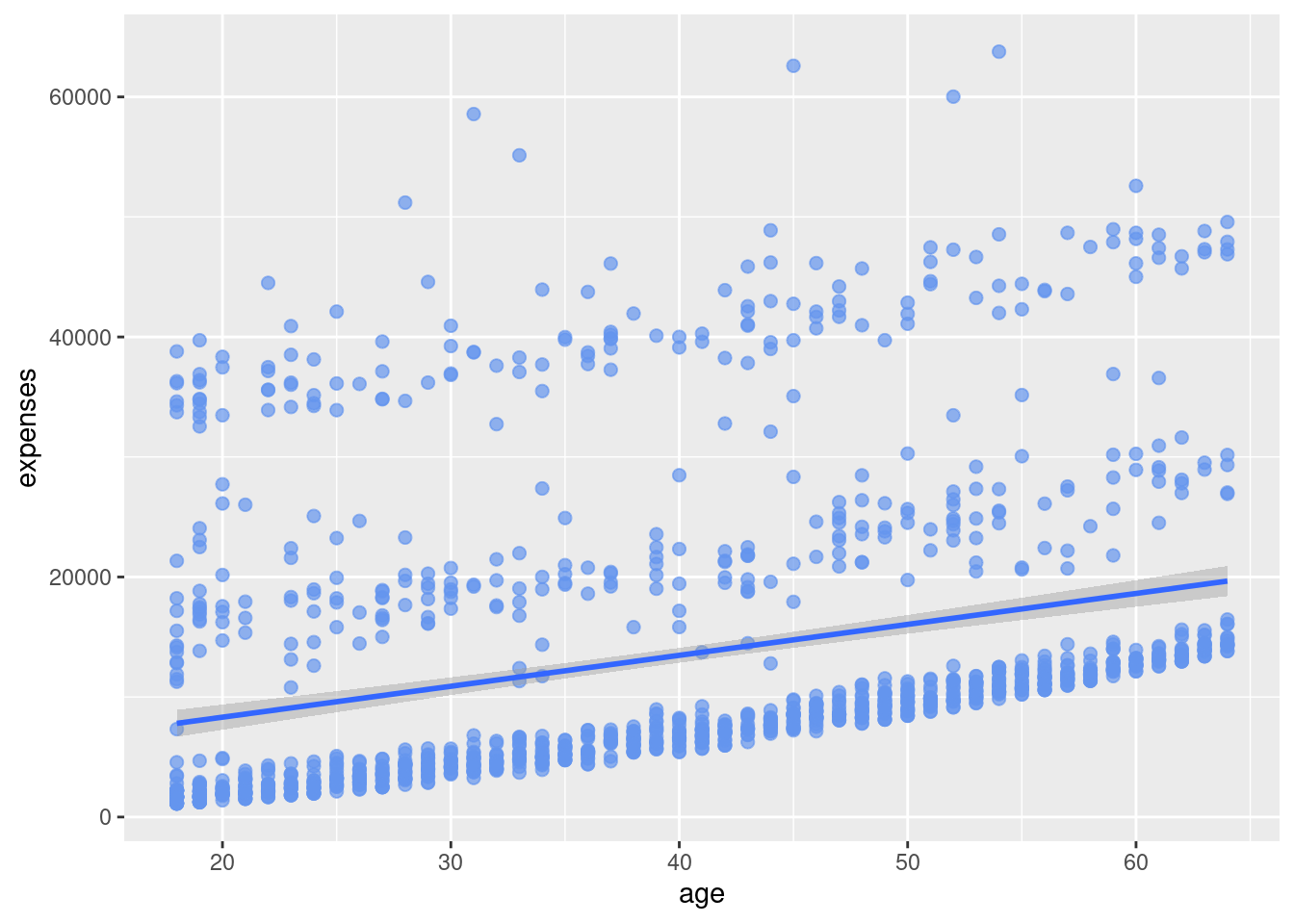 We can see in Figure 17.2 that insurance expenses increase with age, but there is a lot of variability in the data.