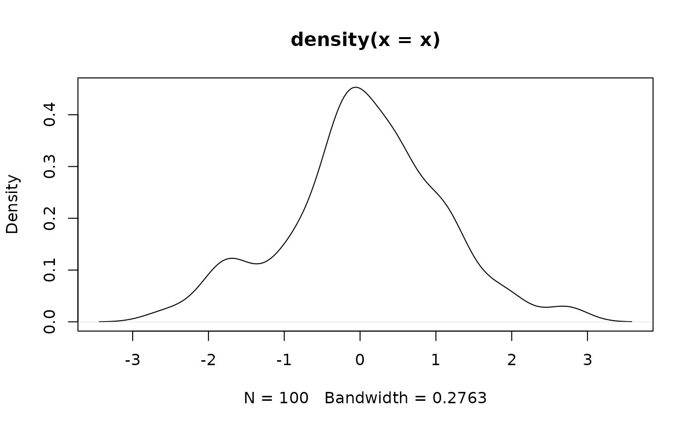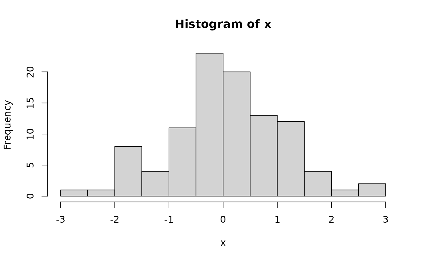 x <- rnorm(100) # 100 random normal deviates