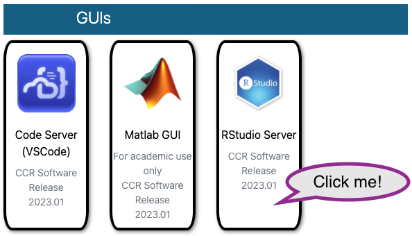 Use your browser to navigate to https://ondemand.ccr.buffalo.edu/. Look under the “GUIs” section, and choose ‘RStudio Server’.