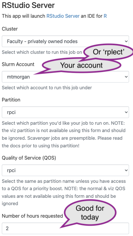 - ‘Cluster’: choose “Faculty - privately owned nodes” (these are ‘Roswell’ nodes)