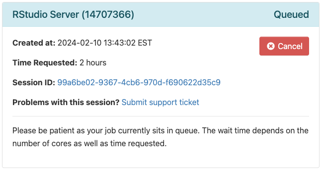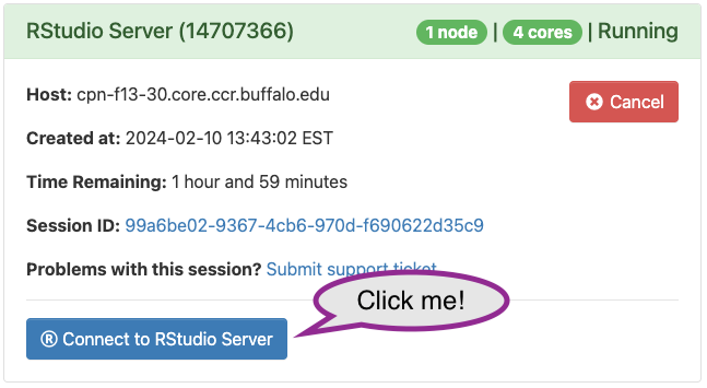Eventually the CCR finds resources for your job, and the queue status changes to ‘Running’, with a link to ‘Connect to RStudio Server’. Click on the link to get to your own session of RStudio.