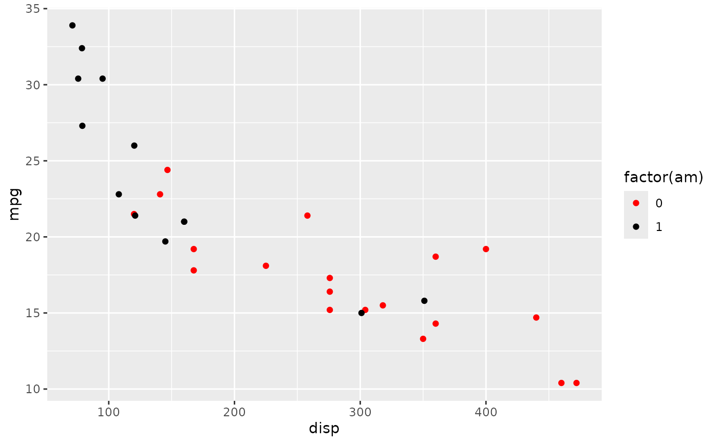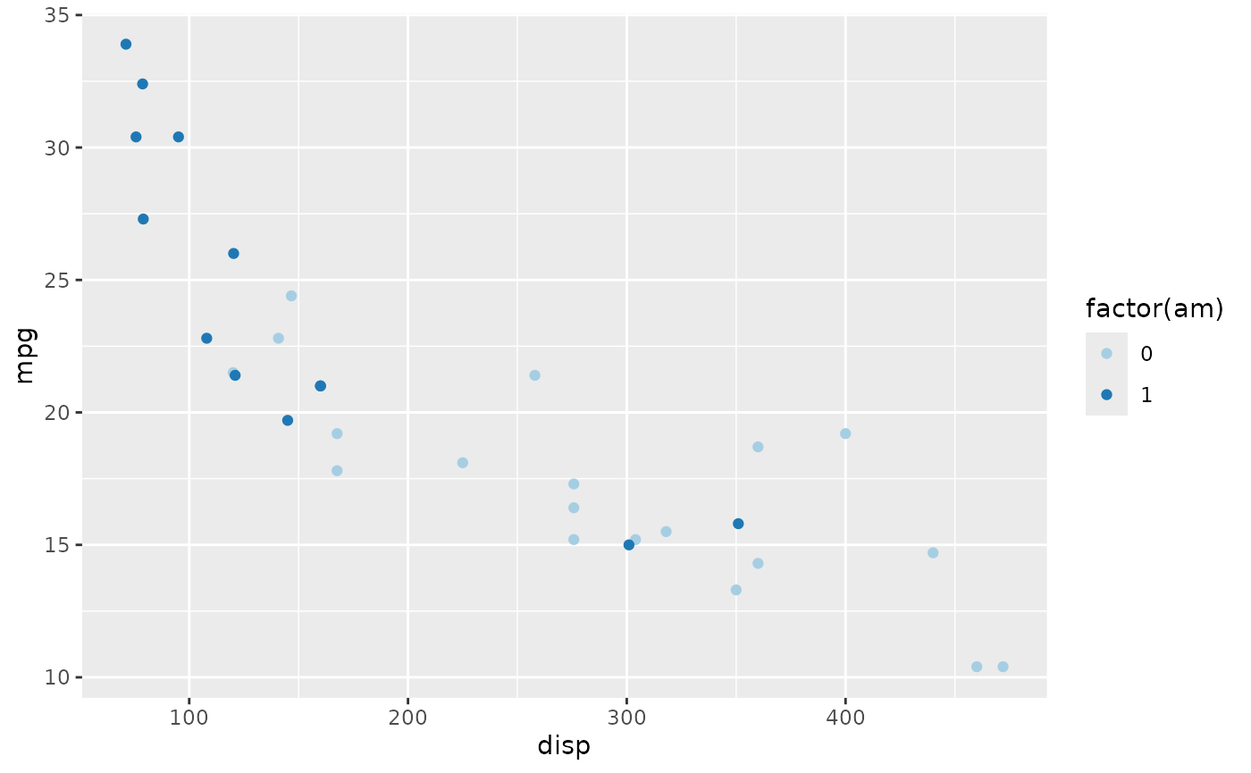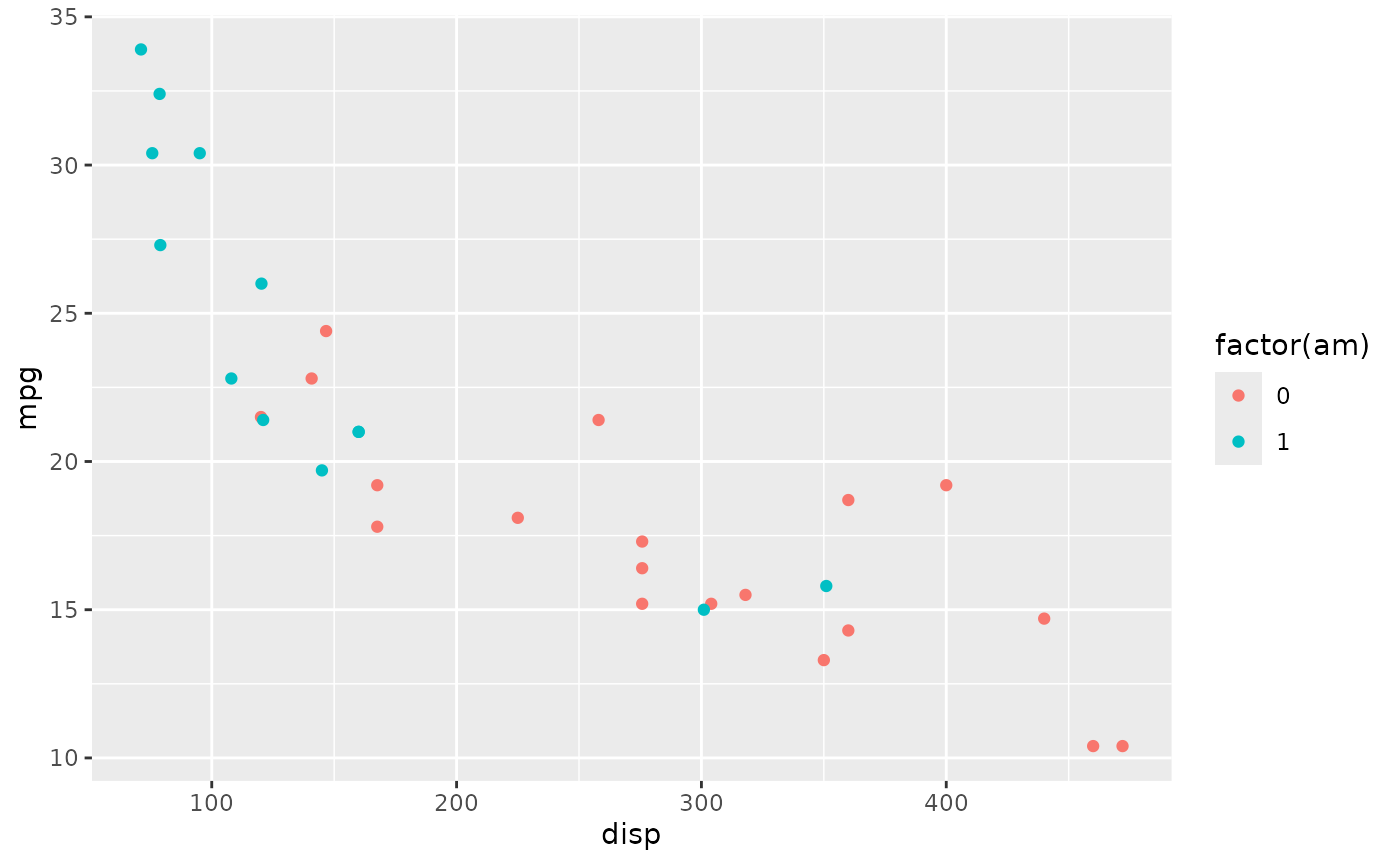 Here’s a simple dataset showing the relationship between miles per gallon ‘mpg’ and displacement ‘disp’ with points colored by transmission (‘am’, 0 is automatic, 1 is manual; using factor(am) turns the continuous variable into a factor, and factors are colored using ‘qualitative’ color schemes, rather than ‘quantitative’ color schemes)